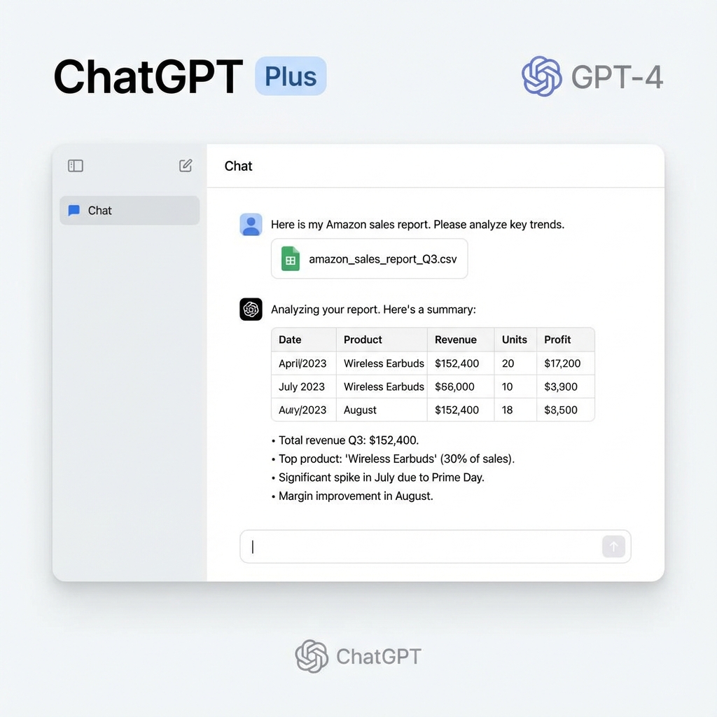 - Data Analyst (Code Interpreter): This is the killer feature. Upload your "Amazon Business Reports" CSV. Ask it: "Which products have high traffic but low conversion?" It will generate a chart and tell you exactly which listings to fix.