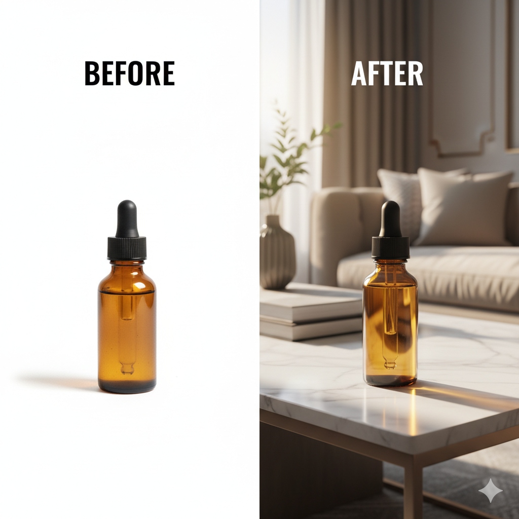 产品摄影是电商最大的瓶颈。 要获得高质量的“生活场景图”(例如:你的香水瓶放在雨林中的长满苔藓的岩石上),你通常需要: